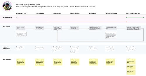 Our research and HMWs made it clear that a "one-size-fits-all" solution would fail. The system needed to adapt to the worker's context. We designed several core journeys to map out how the AIMS Zero app and wearable would work in tandem to create a seamless, intelligent safety net. The following journey map illustrates our proposed solution for the most common everyday scenario: proactively alerting a worker to a known hazard.