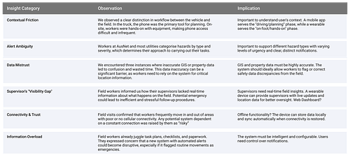 We wanted to translate the high-level insights into an actionable design strategy, and thus I created an Observation-Implication Map. This exercise helped us systematically connect each specific field observation with a concrete design implication. This ensured that our design priorities were not based on assumptions, but were direct responses to the real-world needs and challenges we had witnessed. It formed the evidence-based foundation for our brainstorming phase.